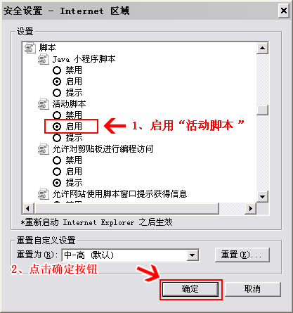在打开的页面中,位于《活动脚本》,单击《启用》后,点击《确定》按钮即可。如下图所示